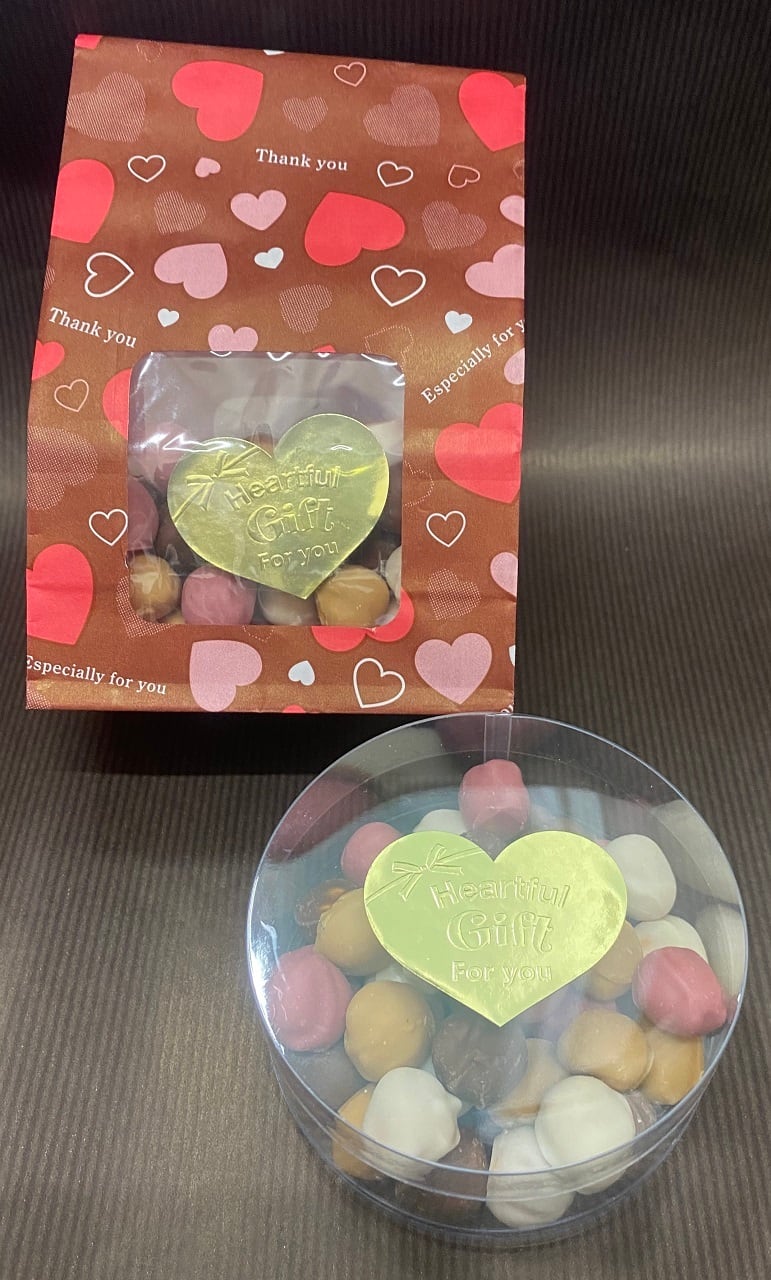 大好評の信州産ヘーゼルナッツを使った『煎りたてヘーゼルナッツチョコレート』に話題のルビーチョコレートでコーティングしたヘーゼルナッツを入れたバレンタイン特別限定詰め合わせです。通常は『ミルクチョコレート』『ホワイトチョコレート』『ゴールドチョコレート』のアソートですが可愛らしく『ルビーチョコ』をコーティング。