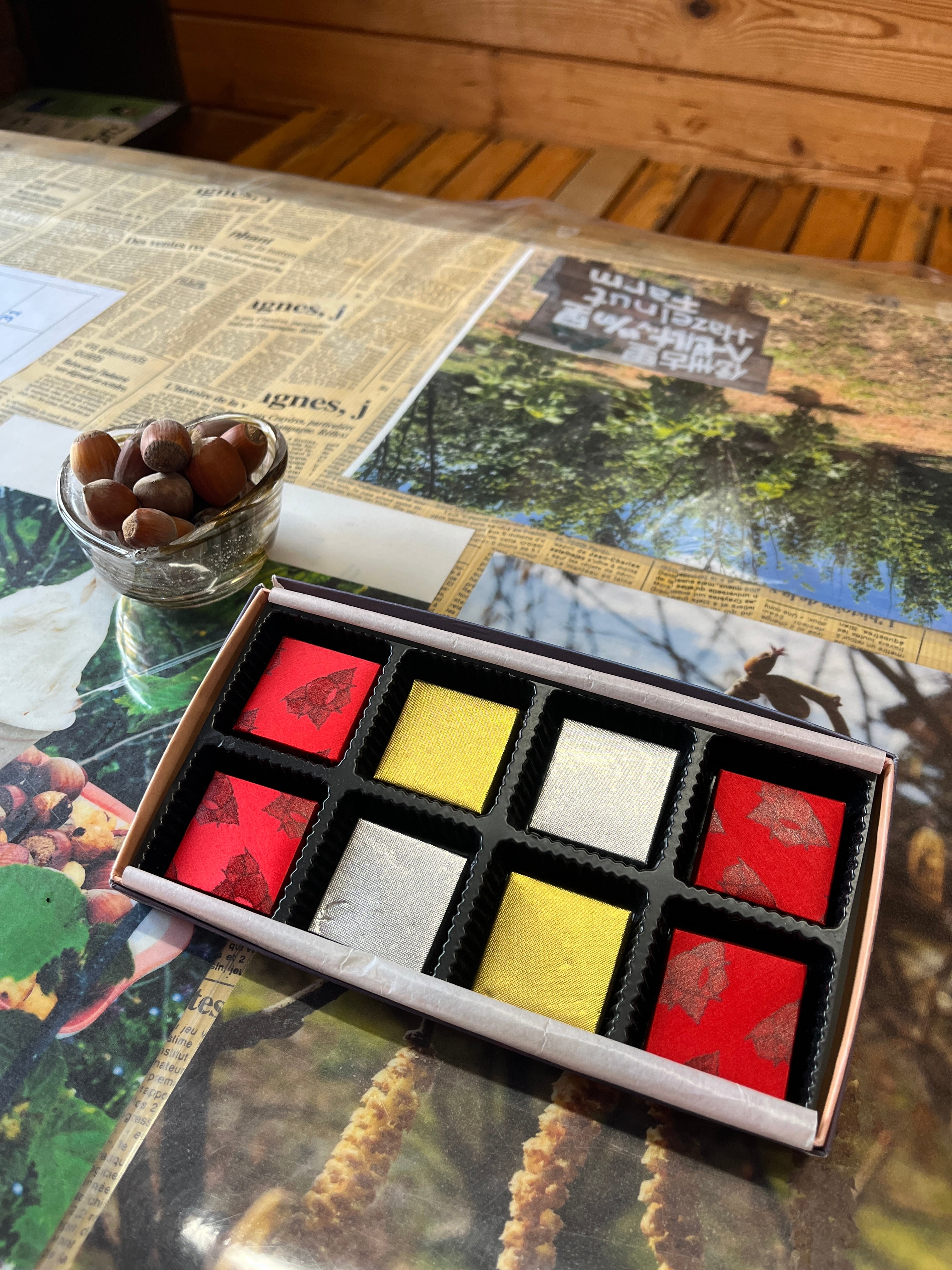 トリノ名産のジャンデュイオットを煎りたての信州産のヘーゼルナッツを使った『ふるフル』オリジナル商品です。ミルクチョコレートとヘーゼルナッツペーストが混然一体となった『黒』とホウィトチョコレートとヘーゼルナッツペーストが溶け合った『白』に加え、1粒で2度おいしい『黒』と『白』が2層に重なった『かさね』をダミエ柄のおしゃれなボックスに全部で10粒詰め合わせた癖になる逸品です。